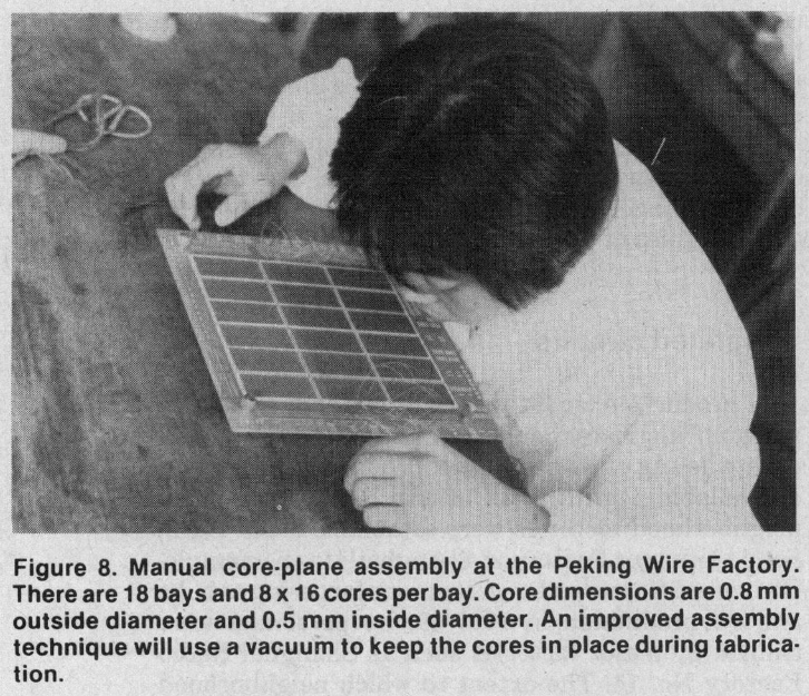 在生产环节,美国人奇怪地发现,各地的计算机制造厂拿到生产图纸之后,不仅要生产计算核心,还需要自己生产组装各种外设配件,各厂家基于相同的图纸生产出来的同型机器也会微妙地不兼容。美国人非常正确地猜测,这个布局的目的是即使半个中国被战争摧毁,剩下的一半还能保持生产运作。计算机的接线工作仍然是纯手工完成——这被美国人称为“1955 vintage”, 集成电路版依然是手工钻孔手工点焊,磁芯内存阵列仍然是手工绕制。他们也参观了当时的IC龙头上海无线电七厂,注意到这里的生产良率极低,原因是空气中污染颗粒太多,而工厂并没有除尘或湿度控制设施。这样的生产条件下,他们生产的芯片集成度要比美国低一个量级,计算机要使用更多的电路板,需要更多的人工接线,也就是更低的生产效率和更差的产品可靠性。美国人还注意到,那个上海的前门窗把手厂频繁地出现在文宣资料里——原来,这是被作为「实践出真知」的典范宣传的。同一年,邓小平出访日本,各处参观后发出了感叹:「我明白了什么是现代化」。
