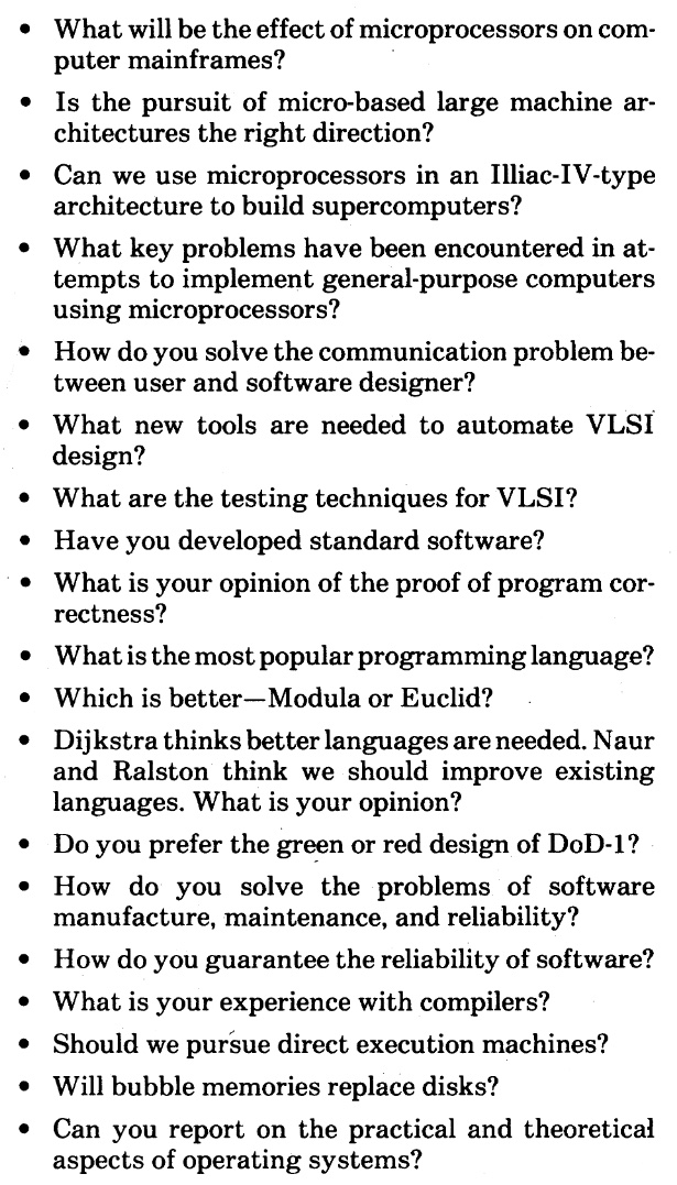 从1972年到1980年的多次访问,美国科学家都给他们的中国同行很高的评价。他们聪明好学,眼界开阔,在极度受限的条件下完成了高质量的工作,对技术借鉴乃至仿制也磊落大方。1978年的报告中,作者摘录了他们的一些提问,从这些问题可以看出他们的眼界和抱负。这些43年前的前辈的问题,不知现在是否都已有了答案: