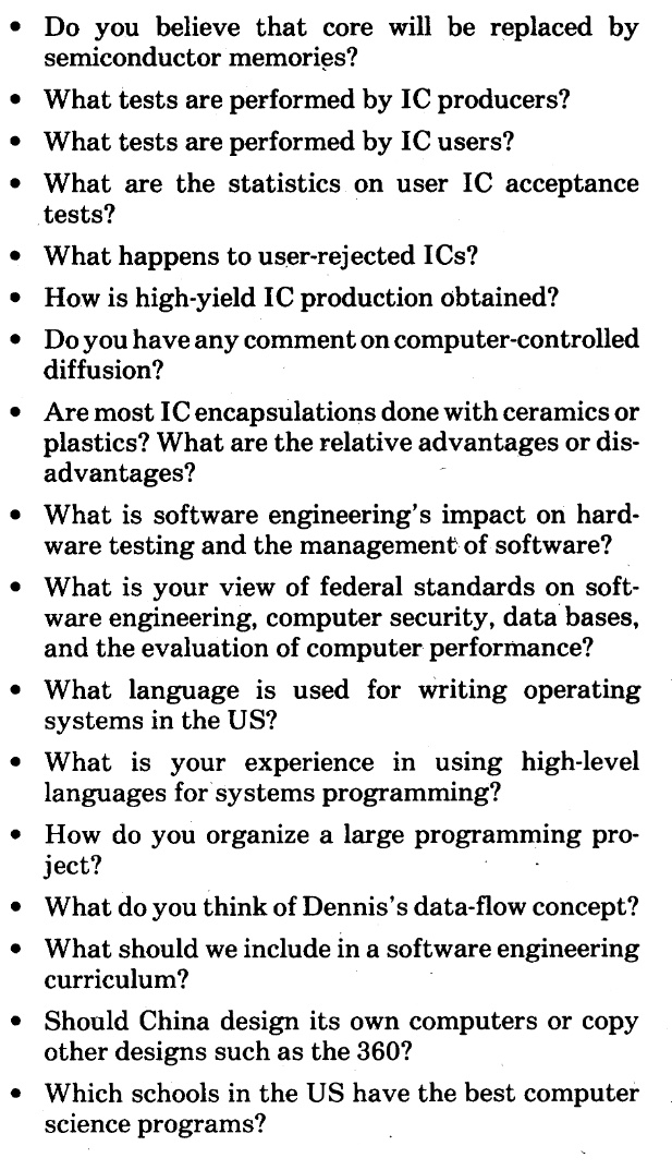 美国人感到的另一个差异是在计算机的软件和应用上——编程语言倒是老熟人,ALGOL60是1972年中国的主流语言,毫无疑问是自己写的编译器(程虎等前辈的工作)。但跟美国不同,中国人主要专注于科学计算,所有的计算机都是批处理系统并且大量使用纸带输入输出,而且对研发超高性能巨型机有蜜汁热忱(到现在都是)。他们对计算机的其他应用场合如商业和生产管理涉猎不多,对与这些应用领域的基础研究如分时系统也兴趣不大——当被问到相关问题时,中国人给了个中国人都懂的中国式回答:“We would like to know what problems you have had with time-sharing. The concepts of time-sharing are understood”.