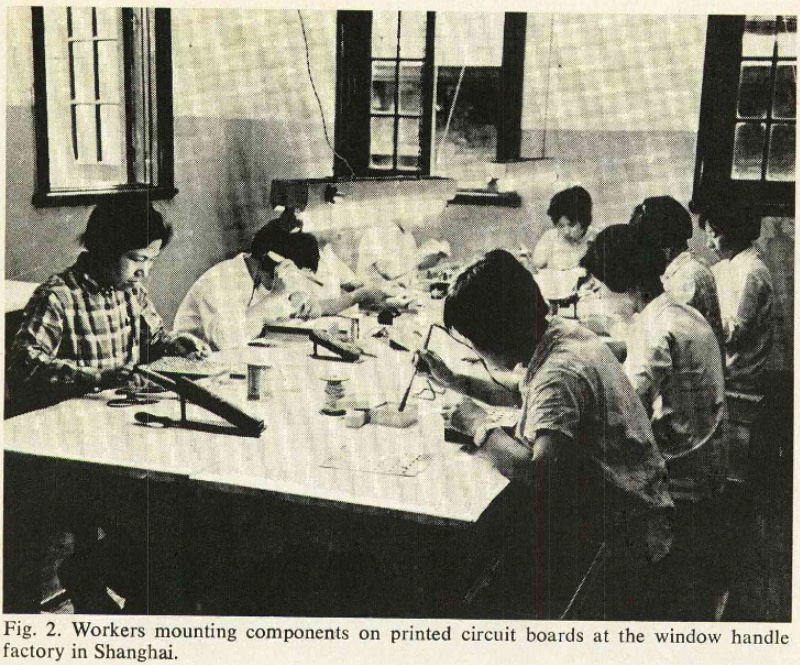 在上海,美国人参观了计算机制造车间。他们被带到上海郊区一处安静的老房子,震惊地发现里面的女工正手工把集成电路焊在印刷电路板上(几年之后Apple I也是这样在乔布斯父母家车库捣鼓出来的)——这里的前身是一个生产门窗把手(!)的社区工厂,工人就是附近的家庭妇女。计算机研究所的研究员来这里搞三结合,把它转变成了一个电路板装配车间。他们也参观了更大的有正式管理的工厂,但是在那里,手工操作也占绝对主导地位。可想而知,在这样的生产条件下,计算机是很难有「量产」的概念的,中国当时全部计算机产量,满打满算一年不过十几台。